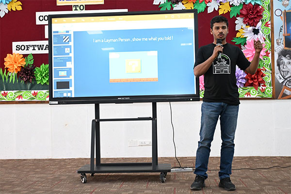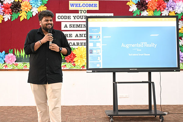 The seminar commenced with a welcoming address by Mr Radha Krishna, Software Engineer at Servicenow[India], who emphasized the critical role of technology in shaping modern society and the increasing demand for skilled professionals in this sector. It provided a captivating introduction to Augmented Reality (AR), distinguishing it from Virtual Reality (VR) by explaining how AR overlays digital information onto the real world, enhancing our perception. He showcased various real-world applications of AR, including: how 2D mathematics forms the basis for graphic user interfaces, image processing, and basic animation. Key concepts discussed included: