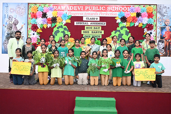 Ramadevi Public School observed No Bag Day on 25th July, 2025 with the theme ‘Eco Day ‘. A special assembly was conducted on this day to raise the awareness of environmental conservation .