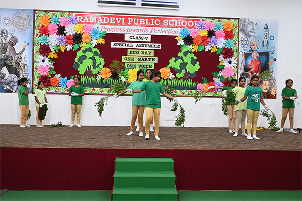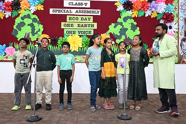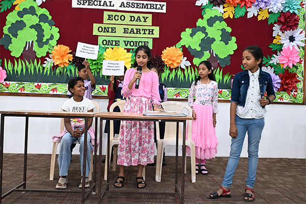 Chandra Sasya of class V E delivered a speech highlighting the significance of environmental conservation and sustainable practices. A melodious song about the importance of trees was performed by students under the guidance of our music instructor Mr Vivekananda. A group of students presented a thought provoking skit about the renowned environmental activist Greta Thunberg emphasizing the role of young minds in driving the positive change. Next it was a ramp walk segment to inspire students to learn from these environmental activists their dedication and passion for protecting the planet. A vibrant dance themed around the importance of trees was performed. A meaningful Eco pledge where students collectively promised to adopt environmental friendly habits in their daily life. Our beloved Principal mam Mrs Qamar Sultana addressed the students applauding their efforts on the performances in bringing the Eco Day a success. Mrs Padma concluded the assembly with a vote of thanks expressing the gratitude to all the participants and attendees.